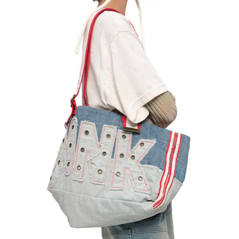 American Retro Heavy-duty Letter Embroidery Metal Rivet Decoration Large Capacity Splicing Contrasting Color Shoulder Bag Trendy